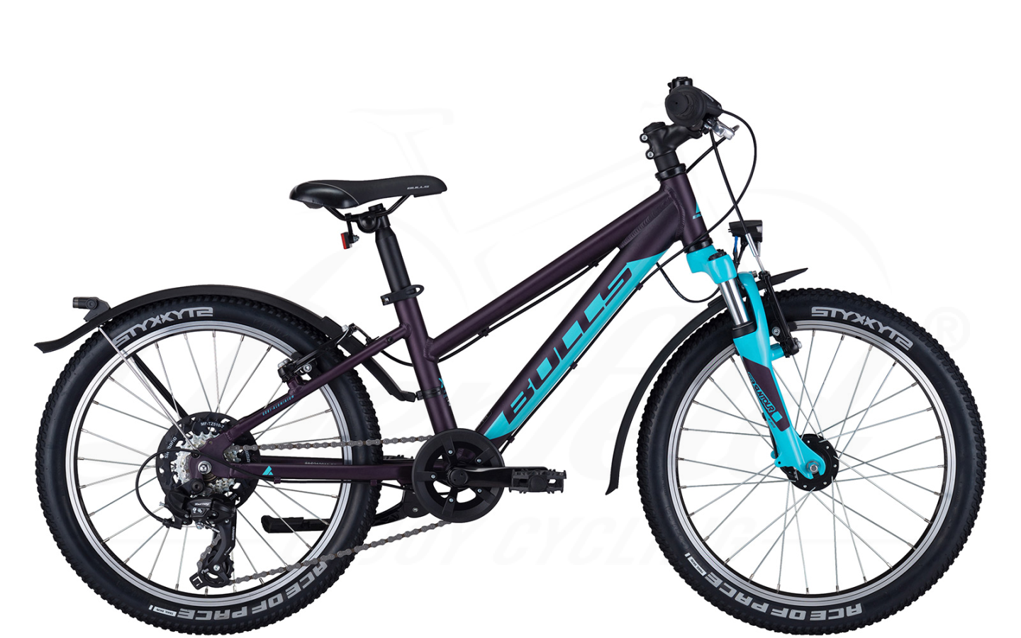 Kleines MTB ganz groß: Vollausgestattet für die Straße, mit Schutzblechen, Fuxon Beleuchtung mit Standlichtfunktion, Klingel und Seitenständer. In dieser Variante mit Shimano Tourney 7 Gang Kettenschaltung. Dazu eine 40mm Gabel vorn. Leicht zu bedienende V-Bremsen sparen Gewicht am Bike. Modell ohne Rücktrittbremse! Ein Gepäckträger ist übrigens problemlos nachrüstbar.