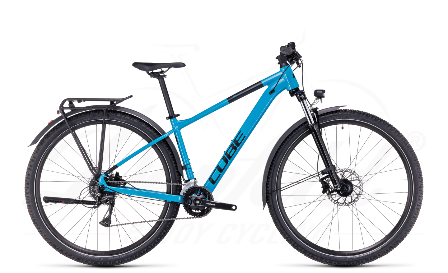 Dieses eine Bike, das wirklich alles kann – gibt es das? Gibt es, sagen wir bei CUBE, und es heißt Aim Race Allroad. Wir haben ihm jedes nur erdenkliche Zubehör spendiert: Schutzbleche, Beleuchtung, Gepäckträger und Seitenständer. Somit liefert es auf dem täglichen Weg ins Büro ebenso ab wie bei der Erledigung von Einkäufen in der City. Und dank 100 mm Federgabel und hydraulischen Scheibenbremsen liest es dir auch beim Offroad-Einsatz am Wochenende jeden Wunsch von den Augen ab. Dazu kommen griffige, komfortabel dahinrollende Reifen und eine Schaltwerk mit hoher Übersetzungsbandbreite.